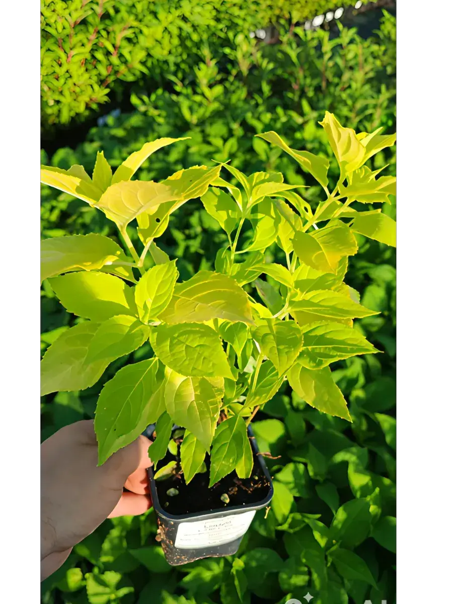 Является потомком Hydrangea paniculata Limelight, представляет собой совершенно новый сорт с очень яркой флуоресцентной желтой листвой. Листья рождаются нежно-зелеными и быстро становятся ярко-желтыми. Очень красивое цветение белыми метелками с легким розовым оттенком, которое приобретается в начале цветения. Компактный сорт, достигающий 60-80 см в диаметре, предпочитает солнечное место. Идеальное, очень яркое, как солнышко растение для сада. Разработано и представлено: Laforet Pepinieres (Франция). Срок цветения: июнь-октябрь.
