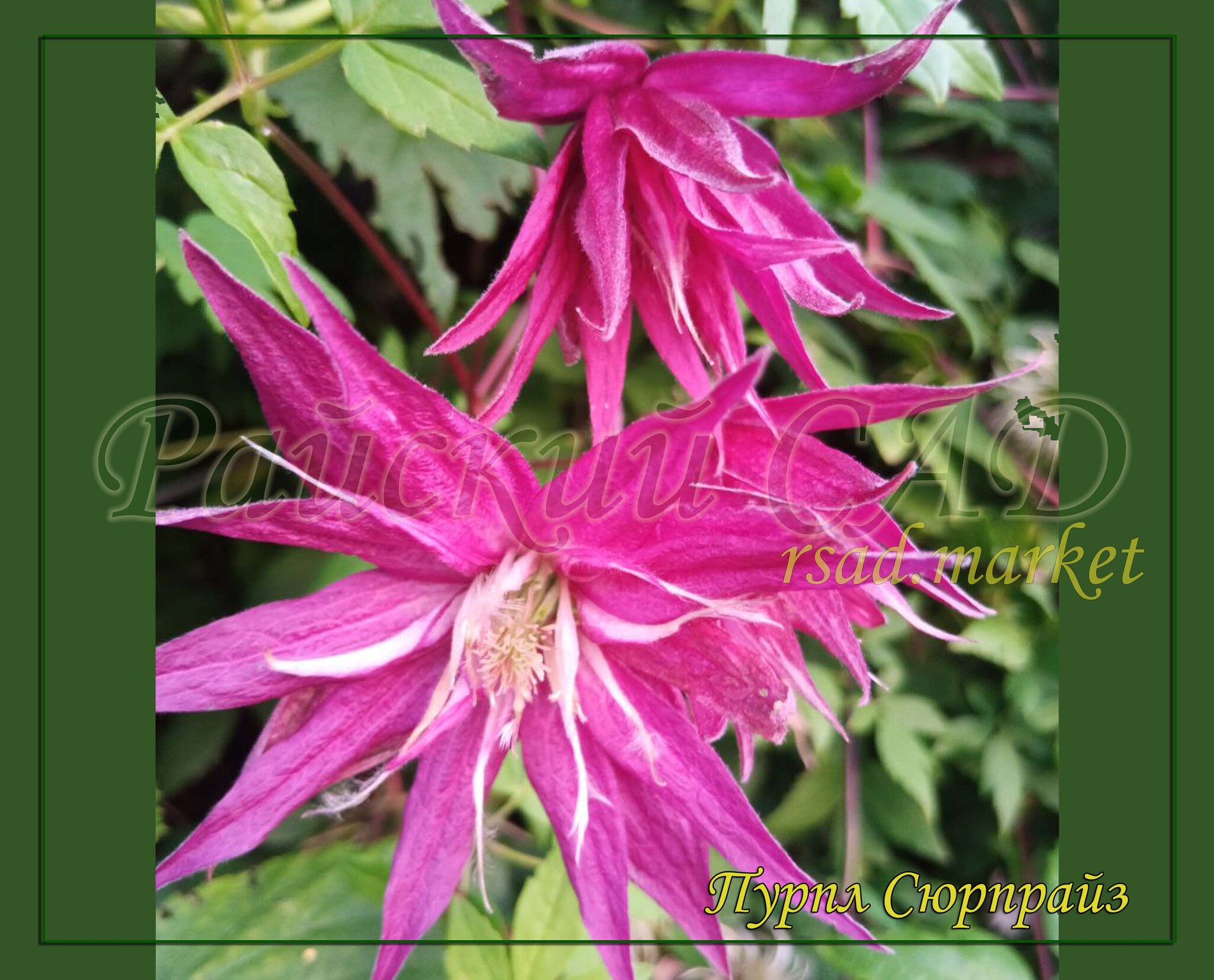 Интригующий польский сорт из серии «Surprise». В саду он может расти с различными типами опор или может переплетаться с лиственными и хвойными кустарниками, а также украшать балконы и террасы. За опору цепляется листовыми черешками. Может использоваться как почвопокровное растение. Цветки крупные для княжиков, диаметром 9-10 см, всегда махровые и полумахровые, пурпурно-бордовые, светлеющие при отцветании, колокольчатые. Они состоят из 4 слегка волнистых, заострённых чашелистиков и 15 стаминодий. Тычинки с жёлтыми пыльниками на кремово-зелёных тычиночных нитях. Цветёт наиболее обильно в мае-июне, повторяет менее обильное цветение с середины июля до середины сентября. Листья тёмно-зелёные, сложные тройчатые с зубчатыми краями. Место солнечное или полутенистое. Высота 250-300 см.