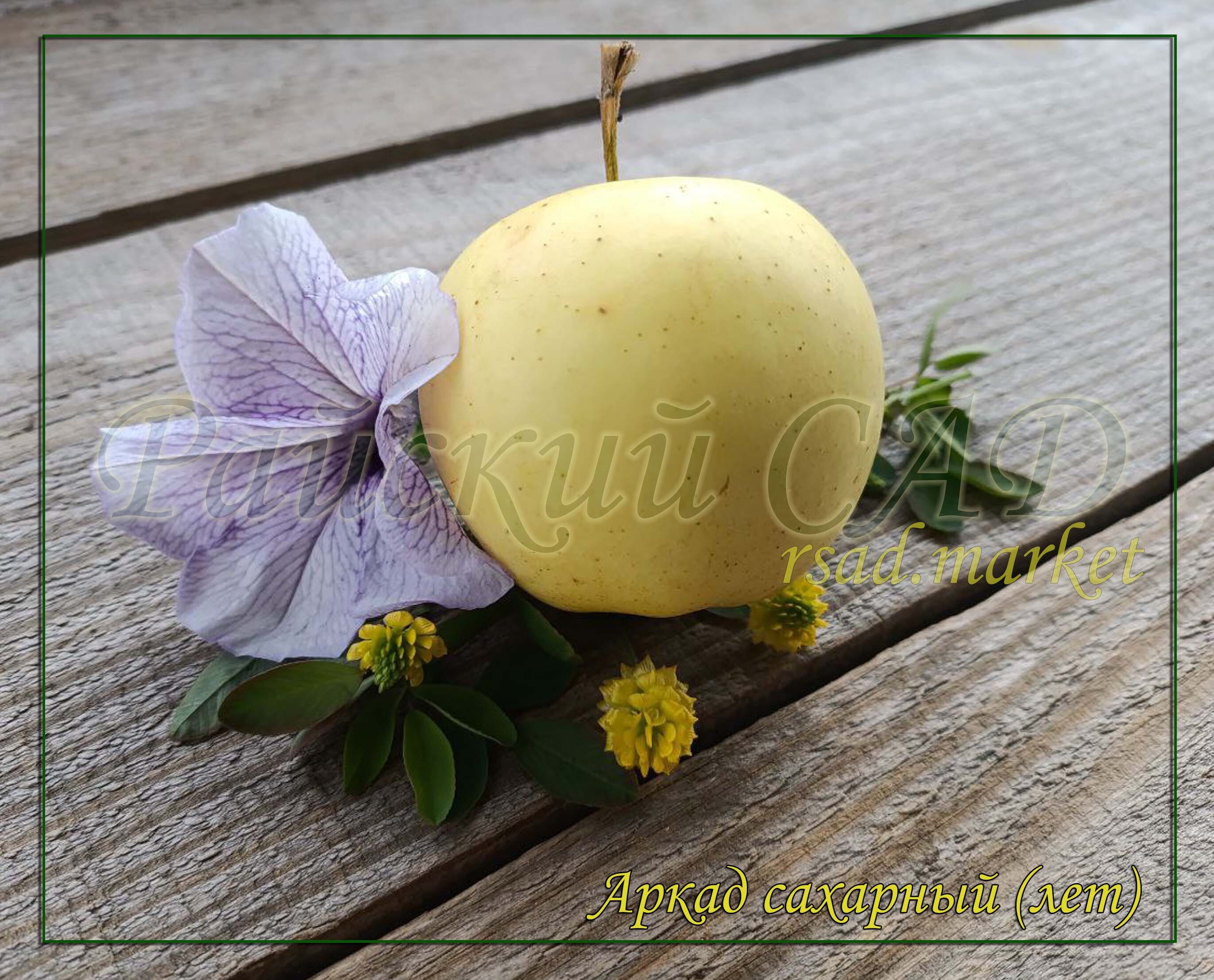 Плоды зеленые, среднего размера. Мякоть белая, зернистая, очень плотная и очень сочная. Вкус безумно сладкий, абсолютно без кислоты. Созревание в конце июля- начале августа, хранятся около месяца.