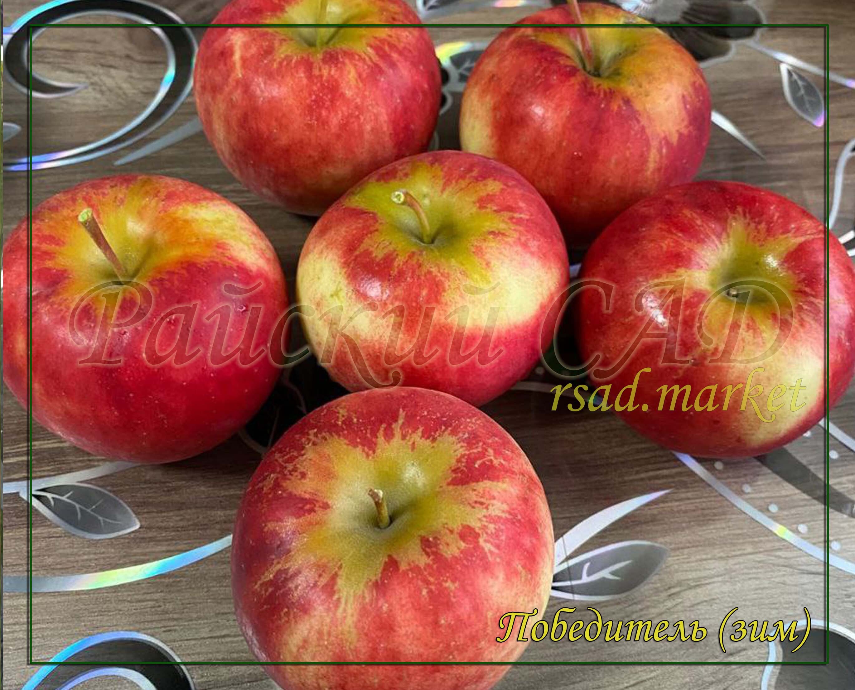 Кожица плотная, блестящая, сильно глянцевая, гладкая, эластичная, средней толщины или толстая, твердая, прочная, хорошо защищает от механических повреждений. Основной оттенок Победителя желтый, ярко-желтый или немного зеленоватый. В период зрелости яблоки покрываются полосато-крапчатым, размыто-пятнистым покровным румянцем карминно-красного или ярко-красного цвета. Подкожные точки многочисленные, выражены неярко, серо-зеленые или сероватые, могут быть слегка оржавленными. Химический состав : Р-активные вещества (катехины) – 257 миллиграммов. Аскорбиновая кислота (витамин С) – 11.9 миллиграмма. Сумма сахаров (фруктоза) – 12.1%. Пектины (клетчатка) – 14.3%.